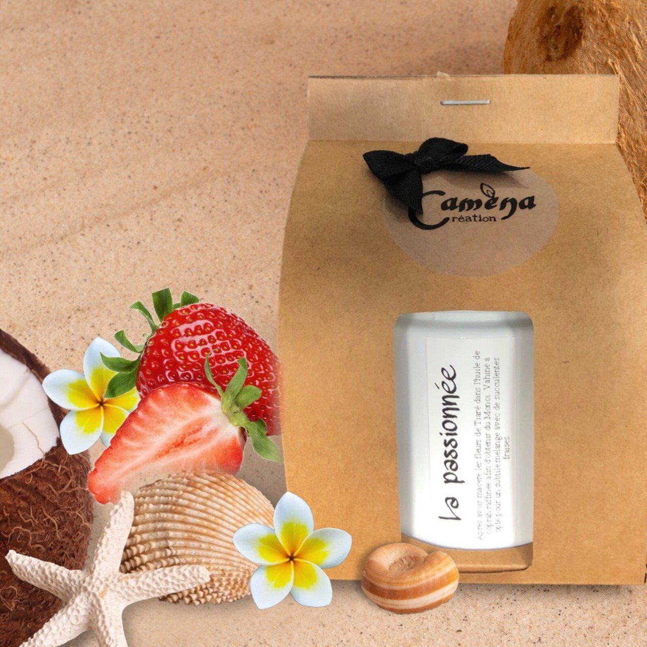 Voyagez vers les îles paradisiaques avec la bougie artisanale La Passionnée, une création unique qui marie exotisme, douceur et gourmandise.